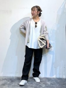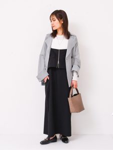 シルエットやフィット感を大切にしたアイテム選ぶが、スタイルアップ効果につながってきます。トップスに、ドレープデザインが施されているアイテムや着丈長めのデザインもウエストやヒップラインなどの気になる部分をカバーしてくれますね。柔らかな落ち感ある素材などは、エレガントに見せてくれるだけではなく体型カバーにもつながります。ラインを意識すると良いのではないでしょうか。