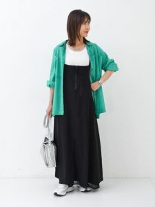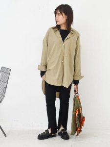 着丈長めのトップスは、ウエストやヒップラインをカバーしてくれるというメリットがあります。ただし、すっきりとメリハリのあるコーディネートに仕上げないと全体がだらしなく仕上がってしまう可能性が高いため注意が必要です。トップス、ボトムスのバランスに注意がするだけでスタイリッシュに見せることができますよ。シャツの場合、こちらのようにインナーとボトムスのカラーを揃えるのも素敵。