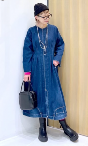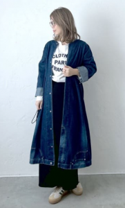 インディゴブルーのデニムコートワンピースは、インナーにどのカラーを持ってきても基本的には安心です。