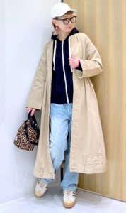 カーキのデニムコートワンピースに薄目カラーを合わせるのは躊躇してしまうかもしれませんが、意外と合います。