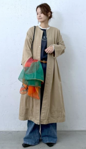 3-3.カーキのデニムコートワンピースには薄目カラー