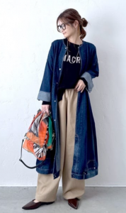 インパクトのあるデニムコートワンピースとバッグで個性を出しましょう。