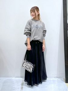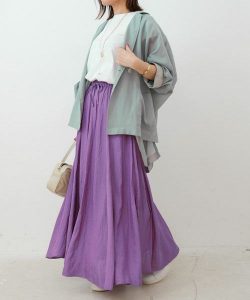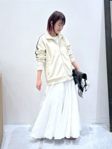 春は、まだまだ肌寒い日も多くスウェットやトラックジャケットなどカジュアルテイストのトップスとスタイリングするのもおすすめ。スポーツテイストのアイテムは、メンズライクな雰囲気や子供っぽくなってしまうのが苦手な方も多いですよね。こんな時、マキシ丈スカートを選ぶことで大人っぽく仕上げることができます。気温が上がっても、風通りのよいスカートスタイルは快適なのも魅力ですね。