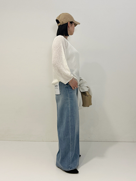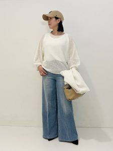 ホワイトカラーのとろみ感ある素材は、エレガントでフォーマルなイメージが強くなってしまいます。こんな時、シンプルなデニムスタイルに選んでみるのがおすすめ。ハイライズストレートなど、落ち着いたシルエットのデニムスタイルの時には綺麗めなトップスなどとスタイリングするののも素敵ですよ。着丈が長めのアイテムは、気になるヒップラインをカバーしてくれるので安心して過ごせますよね。