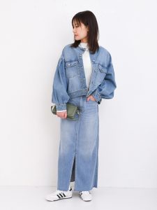 デニム×デニムコーデは、春のトレンドスタイルのひとつです。デニム合わせのスタイルは、お洒落に見えますがバランスが難しい組み合わせのひとつではないでしょうか。大人カジュアルスタイルの法則では、シンプルなカラー、アイテムでコーディネートするということが大前提です。スカートスタイルでは、シンプルでボリューム少な目のタイトシルエットを選ぶと今っぽい雰囲気に仕上がりますよ。