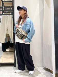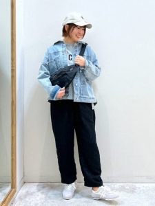 キャップ、デニムジャケット、ウエストポーチを取り入れた、大人のカジュアルコーデ。
