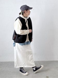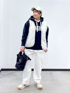 トップスにはネイビーのロゴ入りパーカーを合わせ、カジュアルなスポーティ感をプラスしつつ、ホワイトのキルティングベストをレイヤードすることで、洗練された雰囲気に仕上げている。