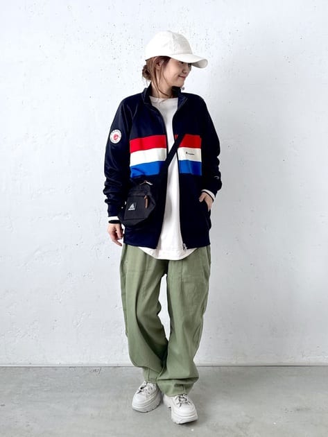 このコーディネートは、チャンピオンの新作、トラックジャケットを主役にしたスポーツミックススタイル。