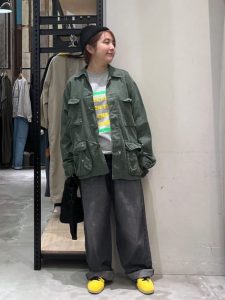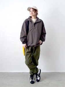 ボトムスはカーキのカーゴパンツをセレクトし、全体のミリタリー要素を強調。