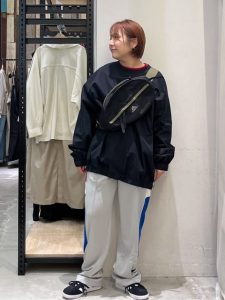 ボトムスにはトラックパンツを合わせ、サイドのブルーラインがアクセントとなり、スポーティな雰囲気をプラスしている。