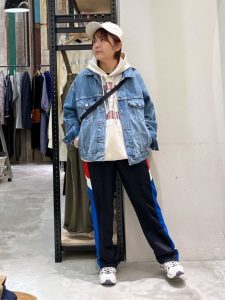 トップスにはロゴ入りのパーカーを選び、カジュアルさを強調しつつ、デニムジャケットを羽織ることで、大人らしいこなれ感をプラス。