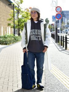 ボトムスにはゆったりとしたダークデニムをセレクトし、ストリートテイストを強調。