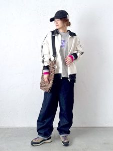 カジュアルなキャップでスポーツ要素を強調しつつ、ベージュのショルダーバッグでナチュラルな柔らかさを加え、全体のバランスを調整。