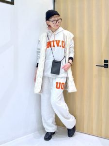 ライトグレーのスウェット上下にオレンジのロゴがアクセントとなり、カジュアルながらもメリハリのあるスタイルに仕上がっている。