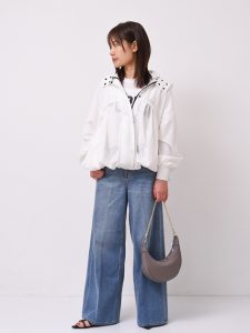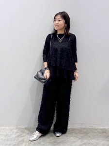 オールブラックなどモノトーンコーディネートの時は、異素材をミックスするのがおすすめ。透け感ある素材や織り、フリンジなど、異素材のアイテムを組み合わせることで、シンプルなコーディネートでも奥行きを加えて楽しむことができます。春夏は、スタイリングアイテムが少なくなるためアイテムを厳選するのがおすすめ。こんな時、トレンドのシアー素材やフリルデザインなども素敵ですよ。