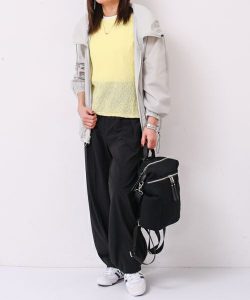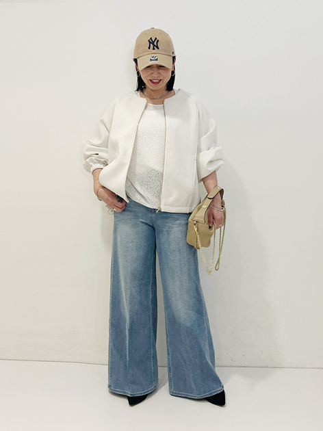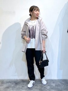 1-1.インナーのスウェット、小物のカラーをホワイトにすることで春らしさを楽しむ