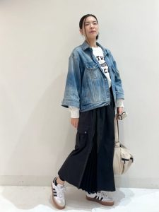 アウターにデニムジャケットを選ぶことで、カジュアルダウンしながら春らしいコーディネートに仕上げています。インナーのスウェットやシューズ、バッグにホワイトカラーを選ぶことでベーシックカラーを選んだスタイルも春らしさをプラスして楽しめますよ。ロゴデザインなどカジュアル感が強いアイテムは、着丈長めのスカートや落ち着いたワイドパンツスタイルに仕上げることで落ち着いて見えます。
