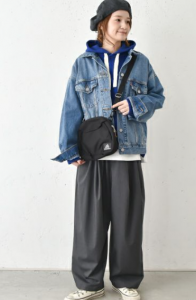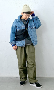 このデニムジャケットにオリーブグリーンのパンツは相性抜群です。カジュアルに着こなすならニット帽に足元はスニーカーで休日コーデに。きれい目に着こなすならインナーをきれい目のシャツに足元はパンプスやローファーを取り入れてみてください。程よくアクセサリーを着けて、バッグもきれい目にするとお仕事コーデの完成ですね。