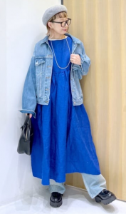 春にはビビットカラーに挑戦したくなりますね。どんなカラーワンピースを持ってきてもデニムジャケットが引き締めてくれるので安心です。ロングワンピースから少し出たパンツがまたお洒落ですね。カラー物を着用する場合、鞄や靴、帽子などは同じカラーでまとめるのが大人コーデのポイント。眼鏡とアクセサリーでさらにこなれた感を出しましょう。