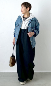 サロペットを大人コーデに仕上げるのは難しいと感じる方も多いのではないでしょうか。 ですがこのでデニムジャケットとサロペットなら安心です。幼く見えないようにアクセサリー類も忘れずに着けましょう。このサロペットパンツは肩紐で調整可能です。