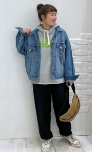 デニムジャケットとデニムのパンツで大人カジュアルに。オーバーサイズのスウェットをトップスで着用することで大人コーデになりますね。程よいゆとりのあるデニムジャケットのインナーにはロゴスウェットを。デニムジャケットの裾よりロゴスウェットが少し長く出ているのが今どきです。帽子やバッグ、靴で個性を出しましょう。
