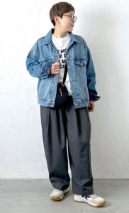 いつものデニムジャケットコーデに飽きてきた方は、襟を少し抜きめに袖はロールアップして着用してみてください。それだけであか抜けた印象になります。ボタンを閉めて着用するとまた違った雰囲気になるのでいつものコーデに飽きたら一度試してみてくださいね。