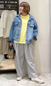 この春はカラーを取り入れてみてはいかがでしょうか。お顔がパッと明るくなる印象です。イエロー×グレー×デニムジャケットは相性抜群です。迷ったらこのカラーをマネしてみてください。もっとスッキリ見せたいなら、インナーをインして足元をパンプスやローファーに変えるだけでグッと印象が変わります。