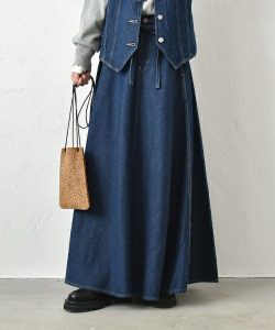 深みのあるブルーデニム素材を使用し、スカートのラインがすっきりとしたAラインシルエットで、スタイルを引き立てます。
