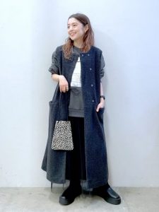 さらに、ボア素材のロングジレを重ねることで、縦長シルエットを強調しながら、こなれた大人の雰囲気を演出します。