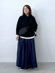 ボリューム感のあるネイビーのロングスカートは、パンツライクなシルエットでメンズライクな印象を引き立てる。斜め掛けしたコンパクトなバッグがアクセントとなり、全体のバランスを引き締めるポイントに。