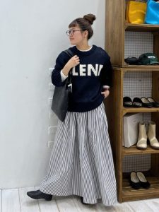 40代のスカートで作るカジュアルコーデとして、動きのあるストライプのコットンボリュームロングスカートが主役のスタイル。