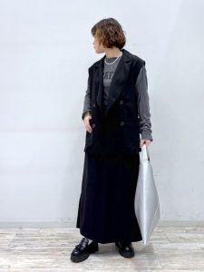 ブラックのロングスカートとベストを組み合わせたシックなスタイルは、洗練された印象を与えながらも程よい抜け感を演出。