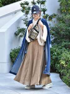 キャップ+ベージュのスカートでナチュラルながらもスポーティーなスタイルに