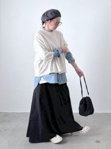 ゆったりとしたトップスとロングスカートを組み合わせた、スカートで作るメンズライクコーデ。