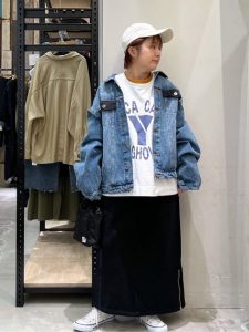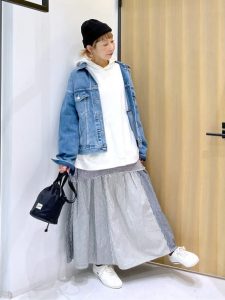 アウターはデニムジャケットを羽織り、カジュアルな中にも統一感を持たせている。