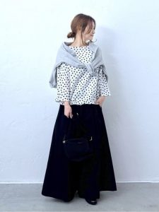 トップスは白地にドット柄のカジュアルなデザインで、肩にかけたグレーのカーディガンが柔らかさと温かみを加えています。