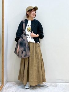 下はナチュラルなベージュのロングスカートで、女性らしさを引き立てつつ、ゆったりとしたシルエットがリラックス感を感じさせます。