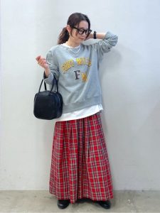 下は赤いチェック柄のロングスカートで、春らしさと爽やかさをプラス。