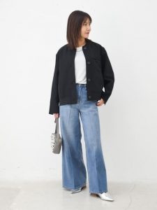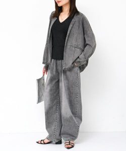 こちらのようなノーカラーデザインを選ぶことで、すっきりとエレガントな雰囲気に仕上げることができます。ライトオンスの軽めの素材が使われているため、今から夏まで活躍してくれるデニムジャケットですよ。同素材のモロッコパンツが用意されているため、セットアップとしてもおすすです。セットアップなので、ゆるっとしたリラクシーなコーディネートを完成させてみるのも素敵ですよね。