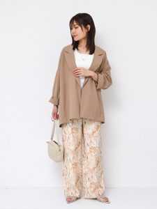 グレージュやブラック、グレーなどベーシックカラーのセットアップがワードローブにあると朝のスタイリングのお悩みを解決してくれますよ。春夏は、ベージュやグレージュなど優しい雰囲気のカラーを選ぶことでセットアップを女性らしい雰囲気で楽しむことができます。こちらのジャケットは、 程よいゆとりがあるシルエットなのでエレガントからカジュアルまで幅広く活躍してくれる優秀な1枚ですよ。