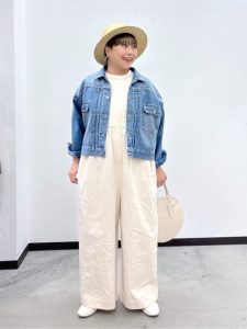 麦わら帽子とラウンドバッグをプラスすることで、ナチュラル感がさらに引き立ち、春夏のお出かけにぴったりな大人のデニムジャケット×サロペットコーデが完成します。