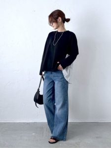 ゆったりとした黒のトップスに、爽やかなブルーのワイドデニムを合わせたリラックス感のあるスタイル。