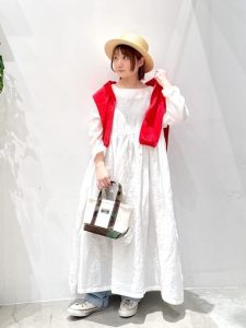 トップスからのぞく白インナーが軽やかさをプラスし、季節感を演出しています。