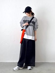 ロゴ入りスウェットにロング丈のブラックデニムスカートを合わせた、大人のカジュアルスタイル。