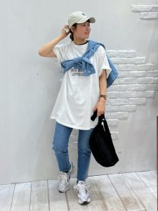 ロゴ入りの半袖ビッグTシャツは体型カバーも叶えつつ、トレンド感も演出。