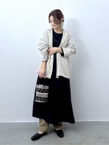 黒のシンプルなワンピースに、ベージュのカーディガンを羽織ってナチュラルでやさしい雰囲気を演出。