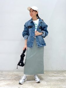 白T×Iラインスカートのシンプルコーデに、デニムジャケットをプラスするだけで春らしい装いに。キャップとスニーカーを合わせて、程よくカジュアルダウン。