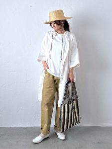 白のシャツワンピにベージュのワイドパンツを合わせて、柔らかくてクリーンな雰囲気に。中は半袖Tシャツで温度調整も◎。麦わら帽子で季節感アップ。