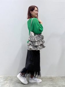 メッシュ素材とフリルデザインが施されているバッグは、シンプルなカラーを選ぶと使いやすいのでおすすめ。トレンド素材をコーディネートアイテムとして選ぶのが難しいものは、バッグなど小物として選んでみてはいかがでしょう。少し大きめのサイズ感なので、お仕事からプライベートなシチュエーションまで、幅広く活躍してくれますよ。肩掛けをすることもできるので、便利なところも嬉しいですね。
