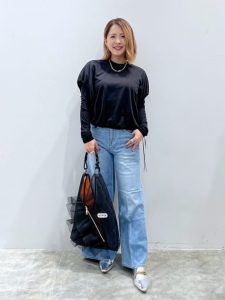 シンプルなシアー素材のトップスとデニムコーデですが、メタリックカラーのシューズを選ぶことでコーディネートのアクセントにしていますね。ゴールドのモチーフがアクセントとなっていますがシンプルなデザインなので、カジュアルからエレガントなスタイルまで活躍してくれますよ。フラットシューズなので、履き心地も抜群で快適に過ごすことができるのはポイントが高いのではないでしょうか。
